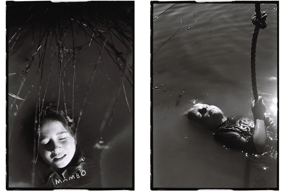 The kids launch themselves from a rope swing tied to a beautiful old gum tree, gnarled and partly hollowed out from being burnt in the fires — twice. The banks are edged with tall, stalky weeds that create such interesting shapes and textures against the water.