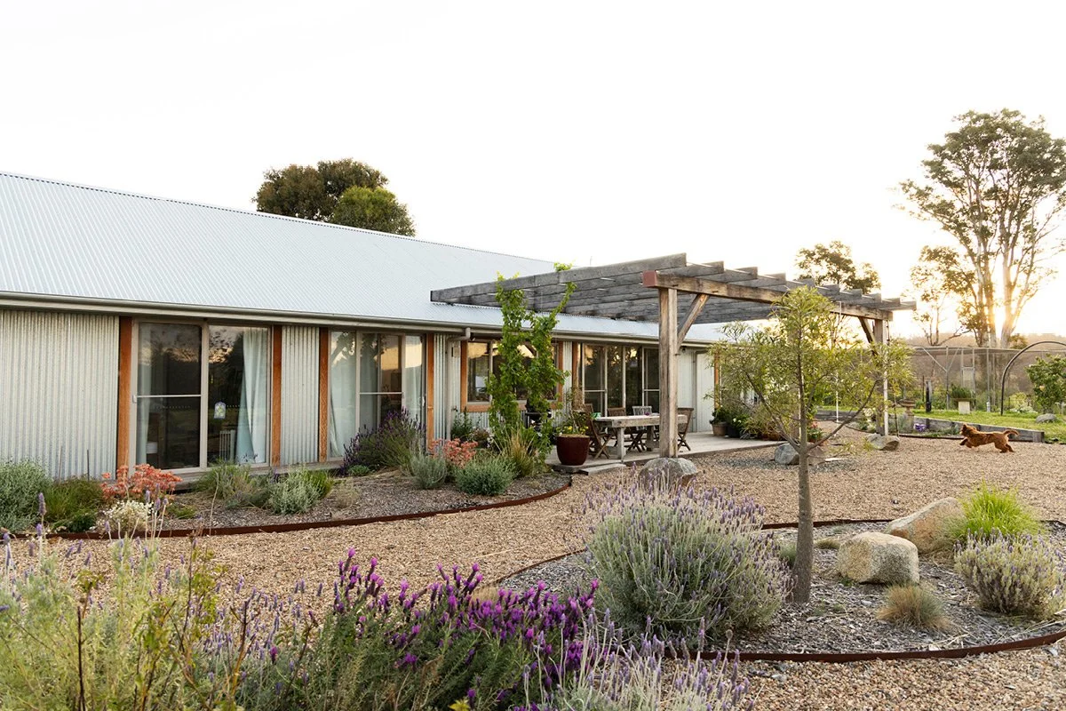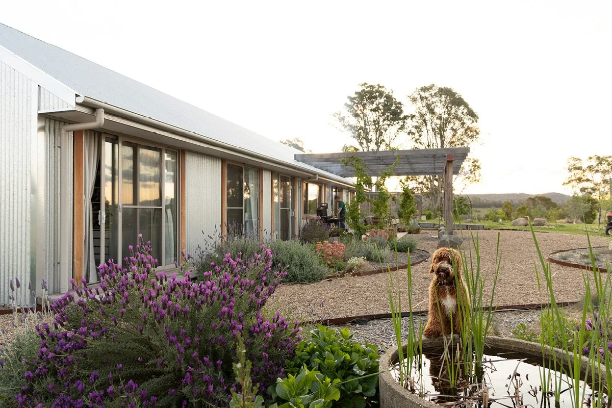 Out the front of the house, the garden shifts in tone. It’s more considered here, planted with tough, resilient species that can handle the wind and dry spells. Lavender blooms against the grey corrugated iron, and the old concrete trough we turned into a fish pond shimmers with reeds. It’s a nod to the rural past of this place and now part of the rhythm of our days. Molly, of course, loves to drink from it.