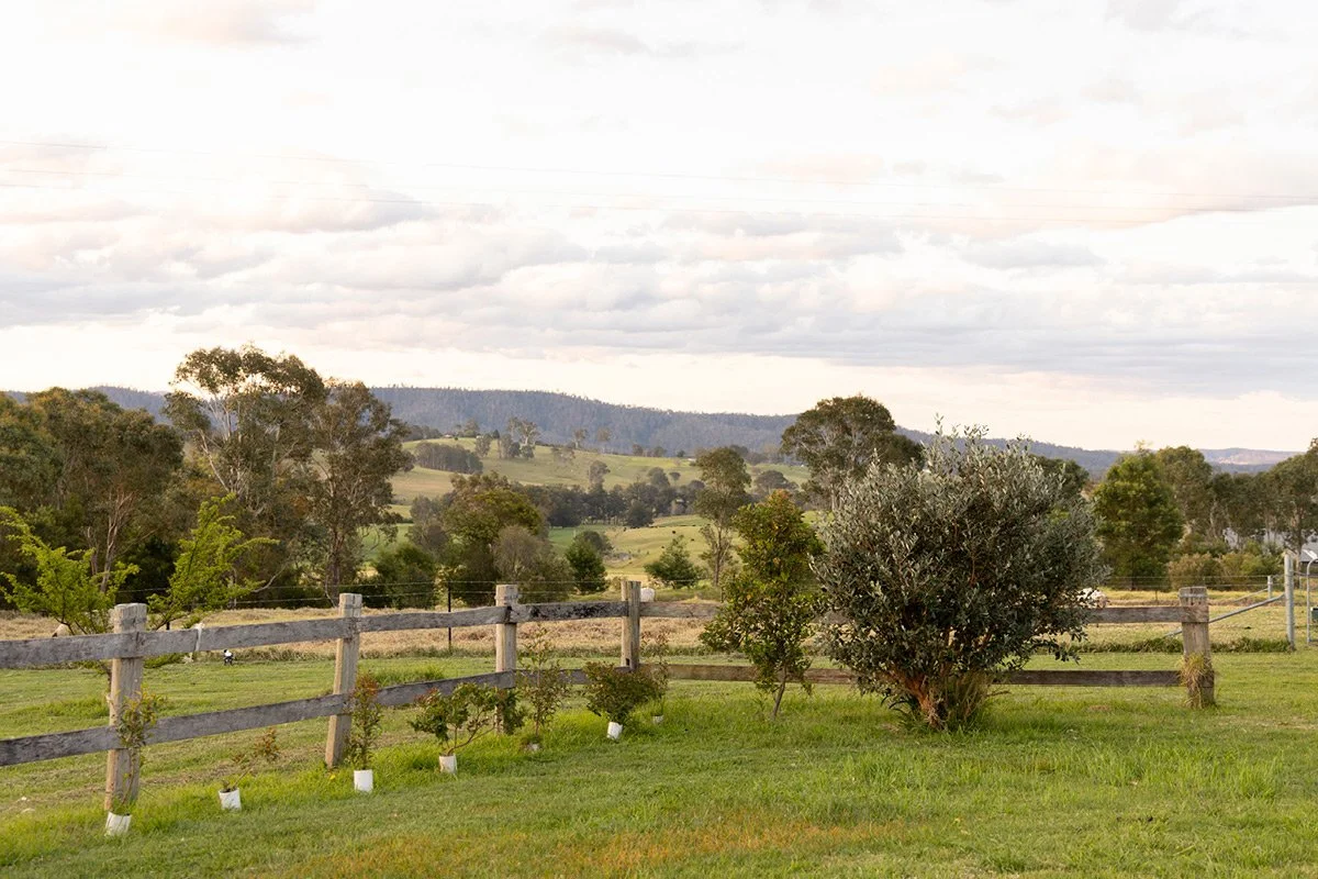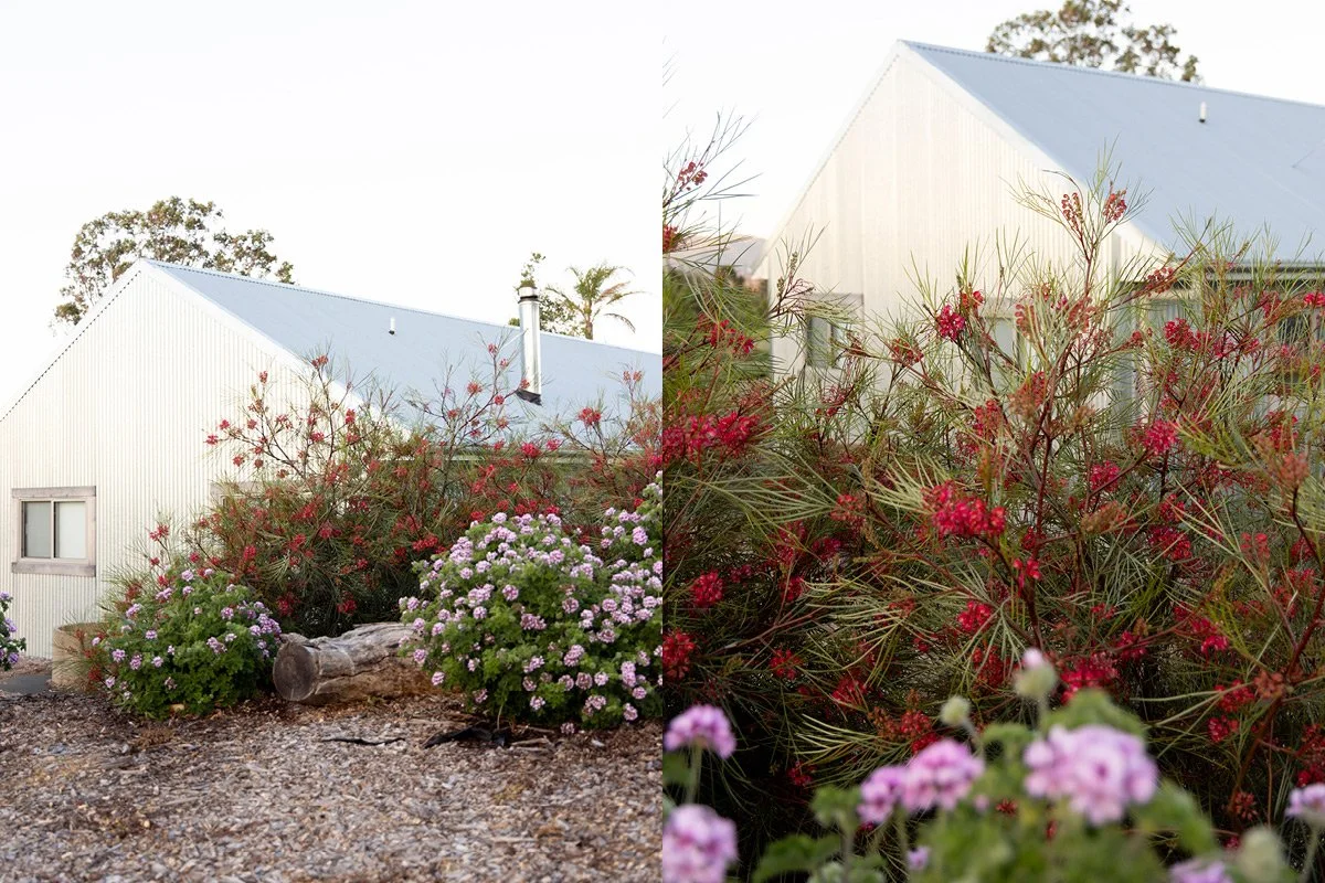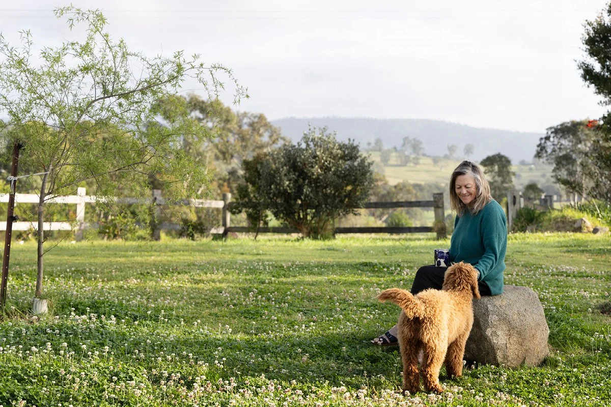 Further along, Mum sits with a cuppa, gazing out at the view with her new dog Molly, a seven-month-old Groodle with soft, curly hair that seems to blend into the clover growing thick and heavy this spring. Behind them, the Flame Tree glows red, alive with rainbow lorikeets feasting among its blossoms.